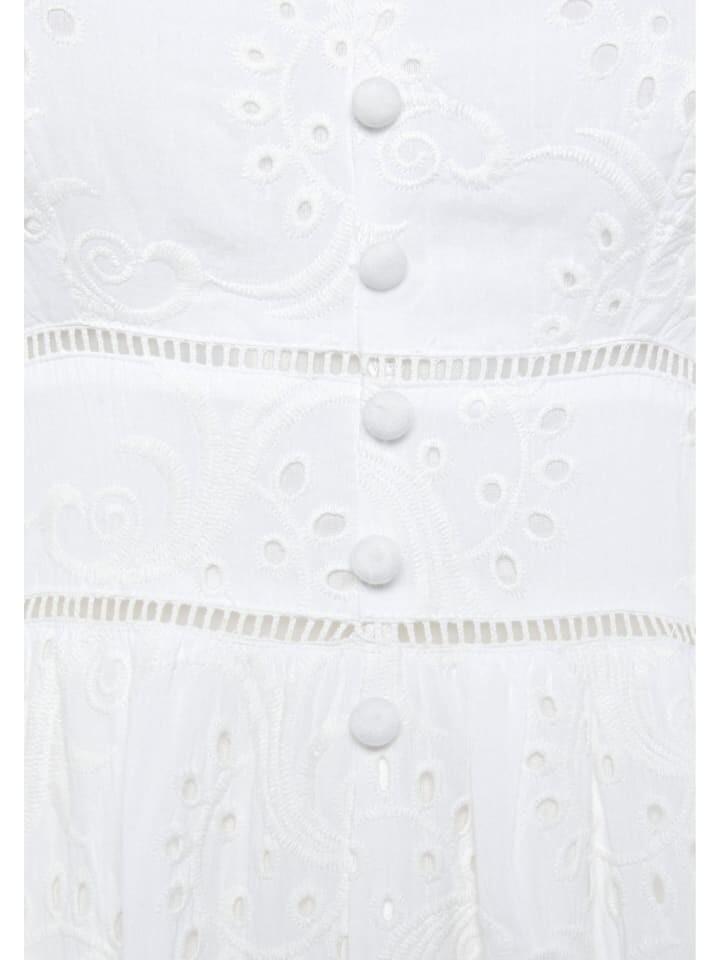 Романтичное платье миди от Buffalo из кружева с люверсами. Регулируемые бретели-спагетти. V-образный вырез и декоративная планка с пуговицами спереди. Спинка с дымовой вставкой. Внутренняя подкладка до колена. Легкая хлопчатобумажная ткань.