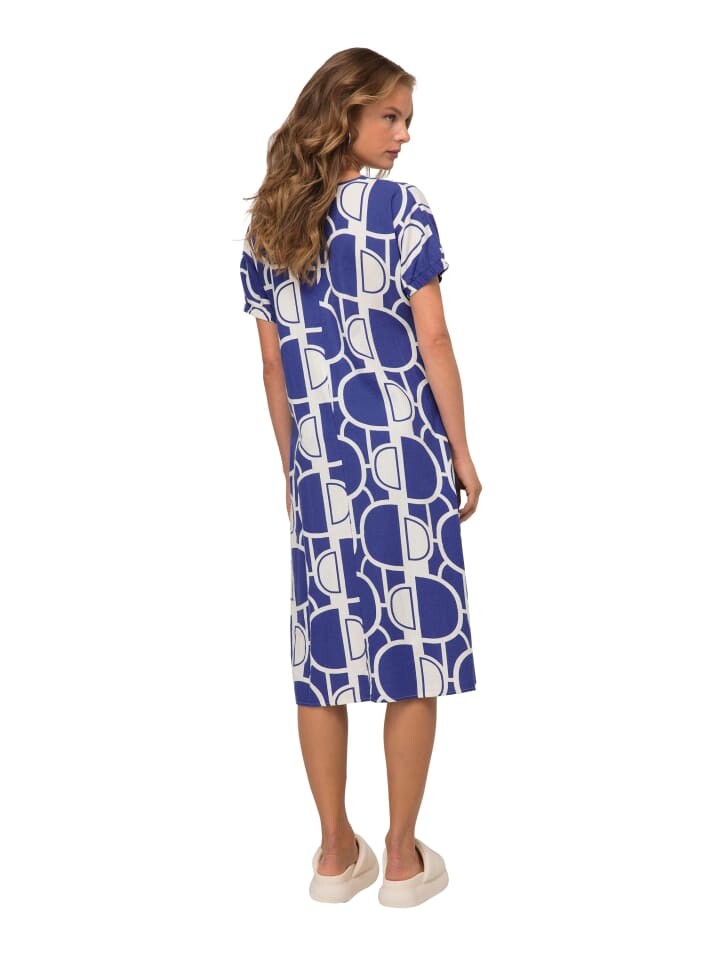 Платье из смесового льна, широкого кроя, с графическим принтом и эластичными манжетами на рукавах. Круглый вырез, заниженная линия плеча.