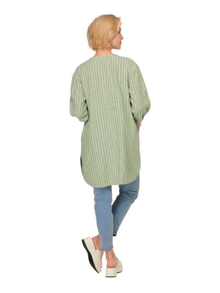 Платье-рубашка из смесового льна в полоску, короткого и удобного кроя. Тщательно выстиранная одежда создает современный повседневный образ. Воротник-стойка с V-образным вырезом и планкой на пуговицах во всю длину. Карманы в боковых швах, закругленный низ с боковыми разрезами - для плавной драпировки и еще большей свободы движений. Широкие рукава-фонарики 3/4 с узкими манжетами.
