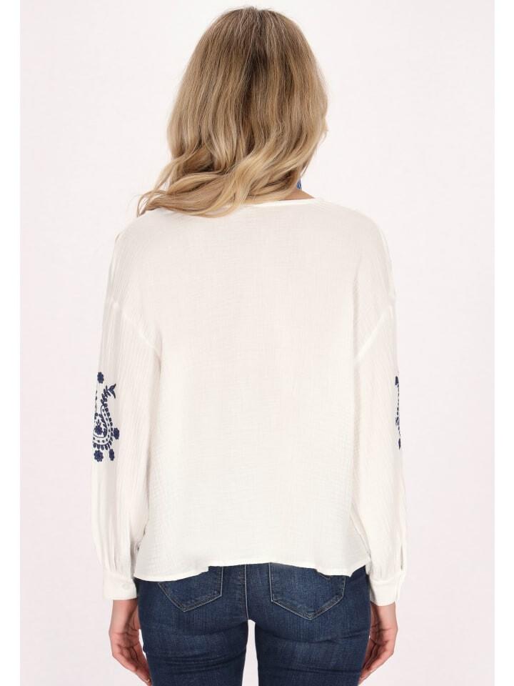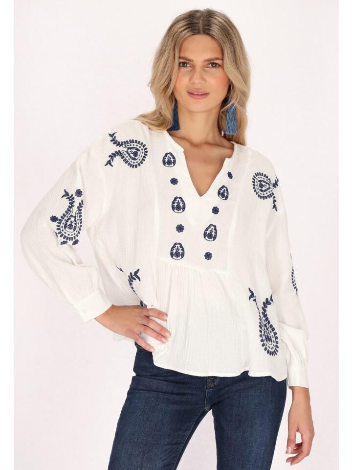 Откройте для себя блузку в богемном стиле, созданную для непринужденного стиля. Топ с V-образным вырезом и длинными рукавами с эластичными манжетами, создающими легкий эффект воздушного шара. Свободный крой дополнен сборками под грудью, которые увеличивают объем и плавность движений. Это изделие, украшенное замысловатой вышивкой в цветочном или пейсли-орнаменте, излучает шарм бохо-шика.
