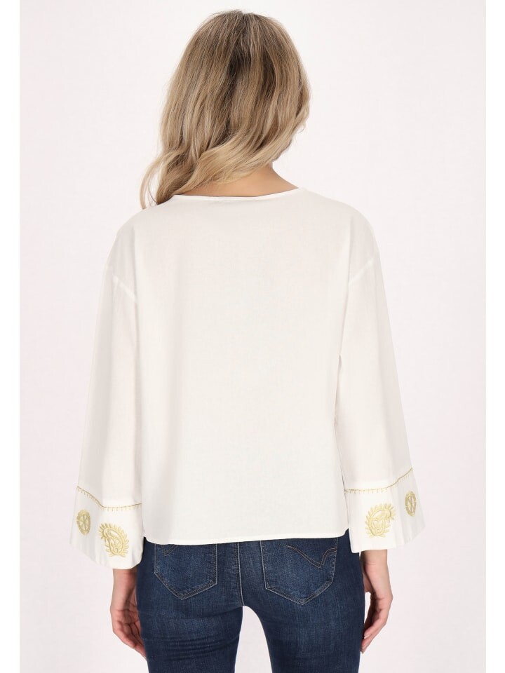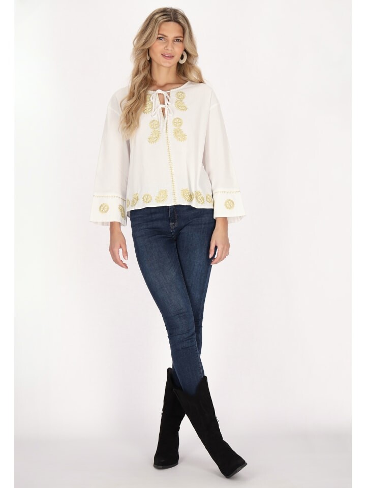 Подчеркните стиль этой хлопковой блузки с длинными широкими рукавами и декоративной вышивкой. Эта особенная блузка, созданная в этническом стиле, идеально подходит для фестивалей. Круглый вырез украшен очаровательной завязкой, а рукава-колокольчики длиной три четверти придают изюминку. Эта блузка с уникальными мотивами станет неотъемлемой частью гардероба.