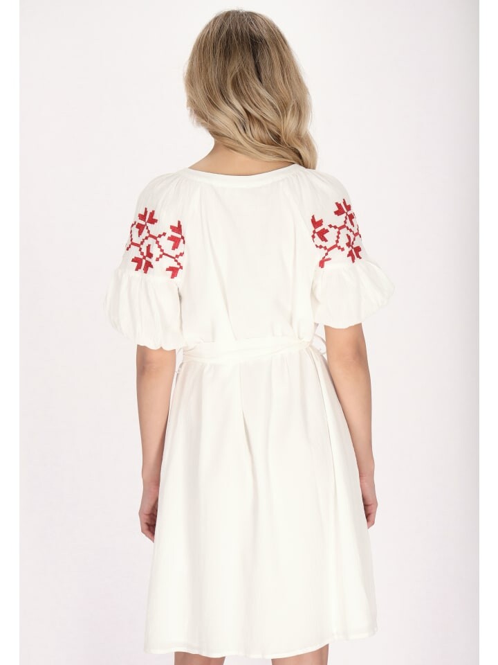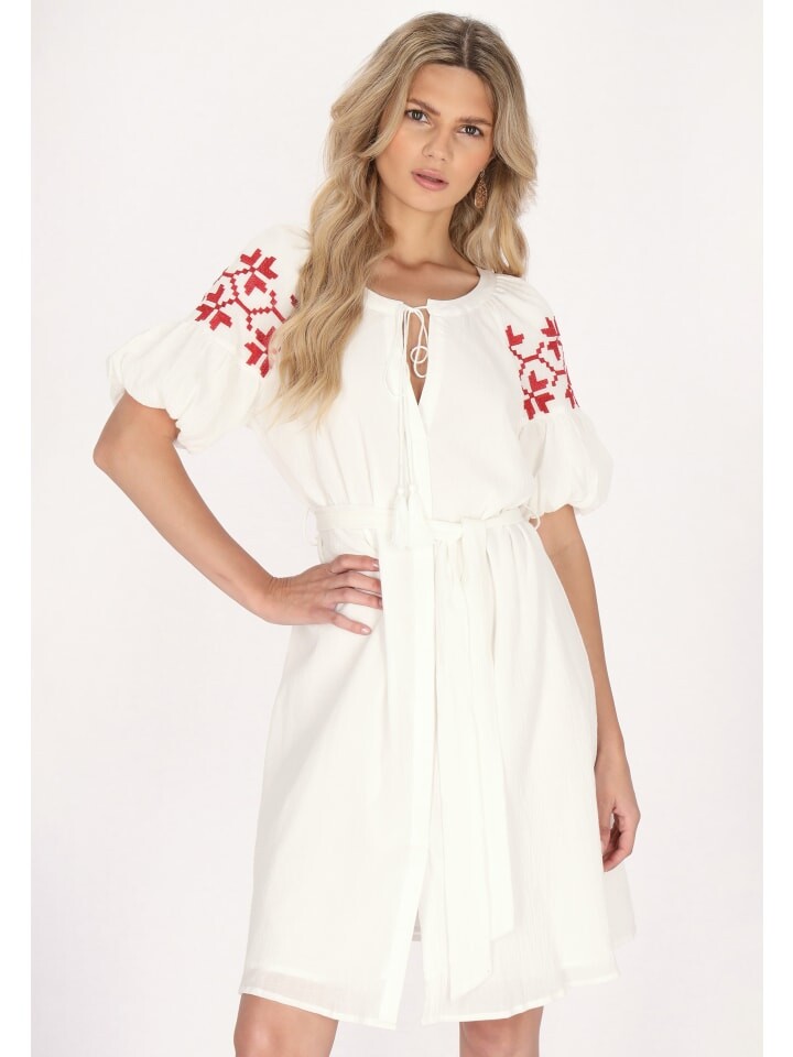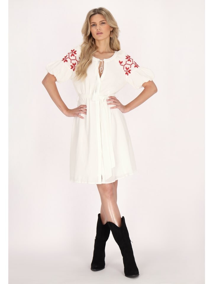 Это особенное мини-платье с короткими рукавами, завязанным вырезом с вышивкой и дизайном в народном стиле. Талия затягивается для регулируемой посадки, а сборы платья создают струящийся силуэт. Это длинное летнее платье, идеально подходящее для тех, кто ищет этнический стиль бохо, излучает непринужденный шарм благодаря рукавам-фонарикам и геометрическим узорам на плечах.