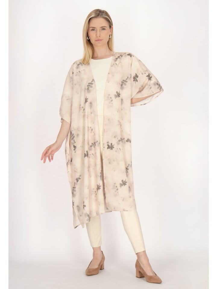 Эта легкая, открытая одежда отличается непринужденной посадкой и широкими короткими рукавами, элегантно спадающими с плеч. Простой вырез горловины и прямой низ, украшенные цветочными мотивами, создают повседневный, но струящийся силуэт. Идеально подходит для теплой погоды или в качестве легкого накидки поверх другой одежды. Эта модель излучает непринужденный стиль и комфорт.