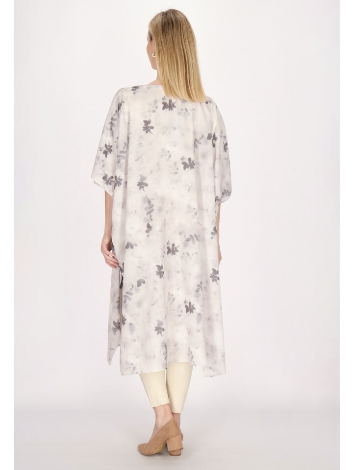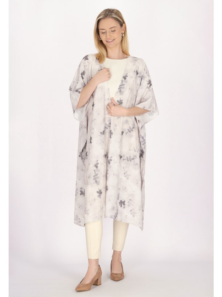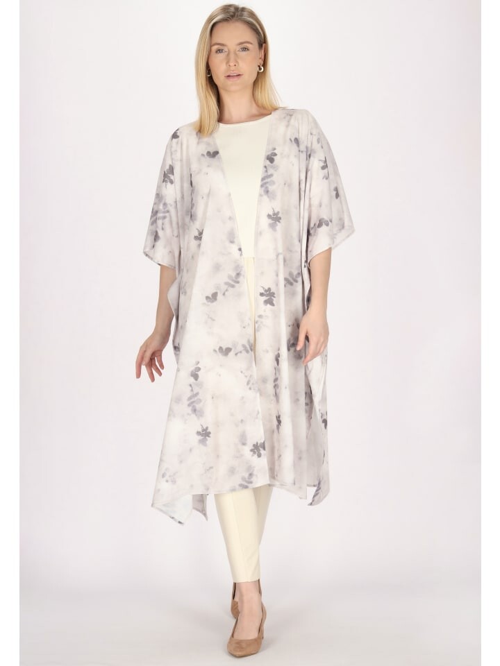 Эта легкая, открытая одежда отличается непринужденной посадкой и широкими короткими рукавами, элегантно спадающими с плеч. Простой вырез горловины и прямой низ, украшенные цветочными мотивами, создают повседневный, но струящийся силуэт. Идеально подходит для теплой погоды или в качестве легкого накидки поверх другой одежды. Эта модель излучает непринужденный стиль и комфорт.