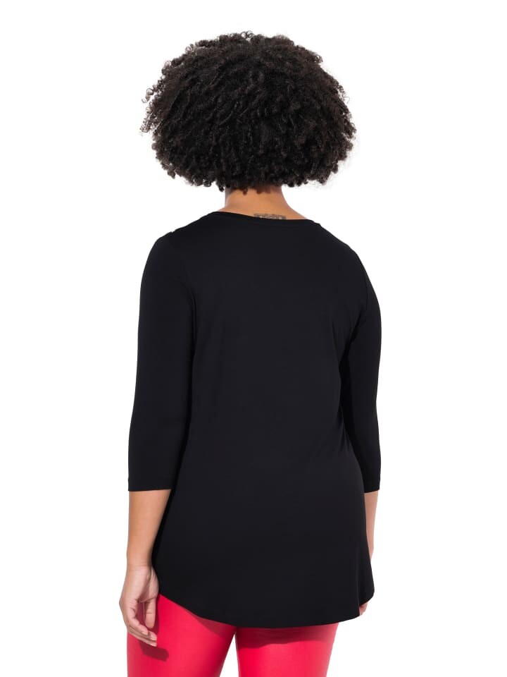 Футболка А-силуэта из мягкого трикотажа со звездами спереди. V-образный вырез, рукава 3/4. Низ сзади удлинен.