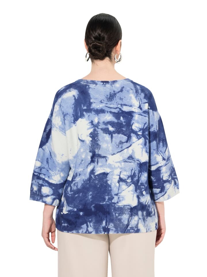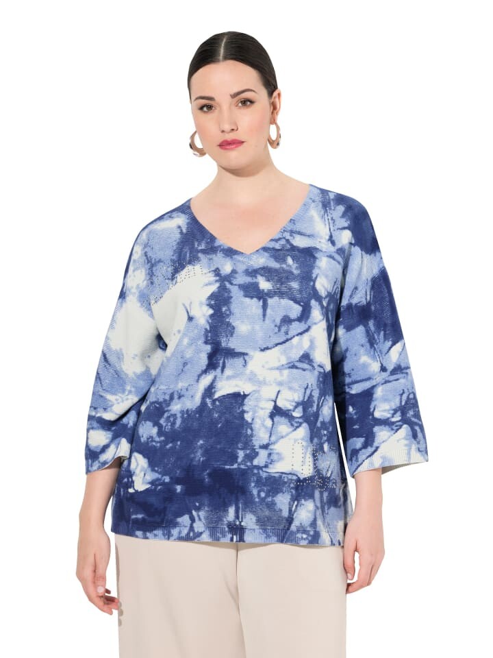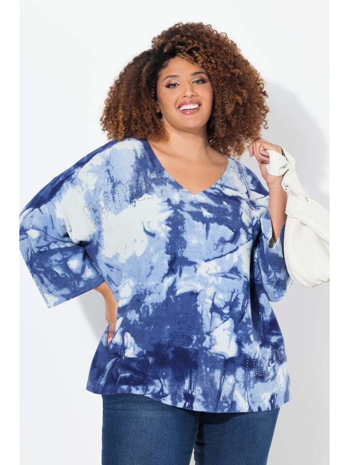 Свитер оверсайз из мягкой платочной вязки с принтом тай-дай и блестящими декоративными камнями. V-образный вырез, заниженная линия плеча, прямые рукава 3/4, ребристые манжеты. Внешний материал: 100 % хлопок.