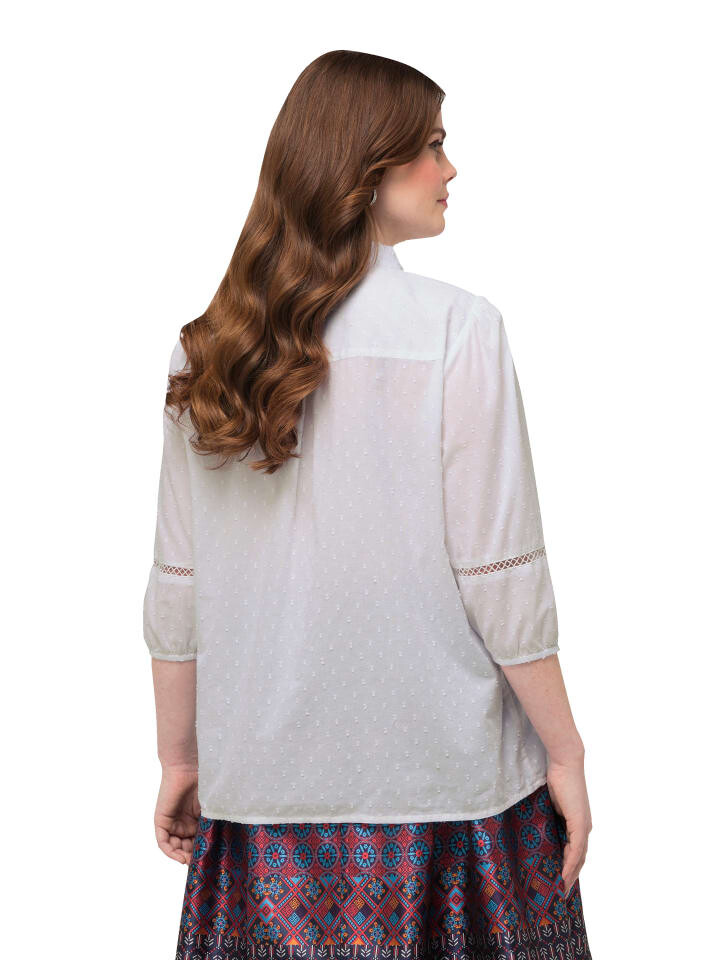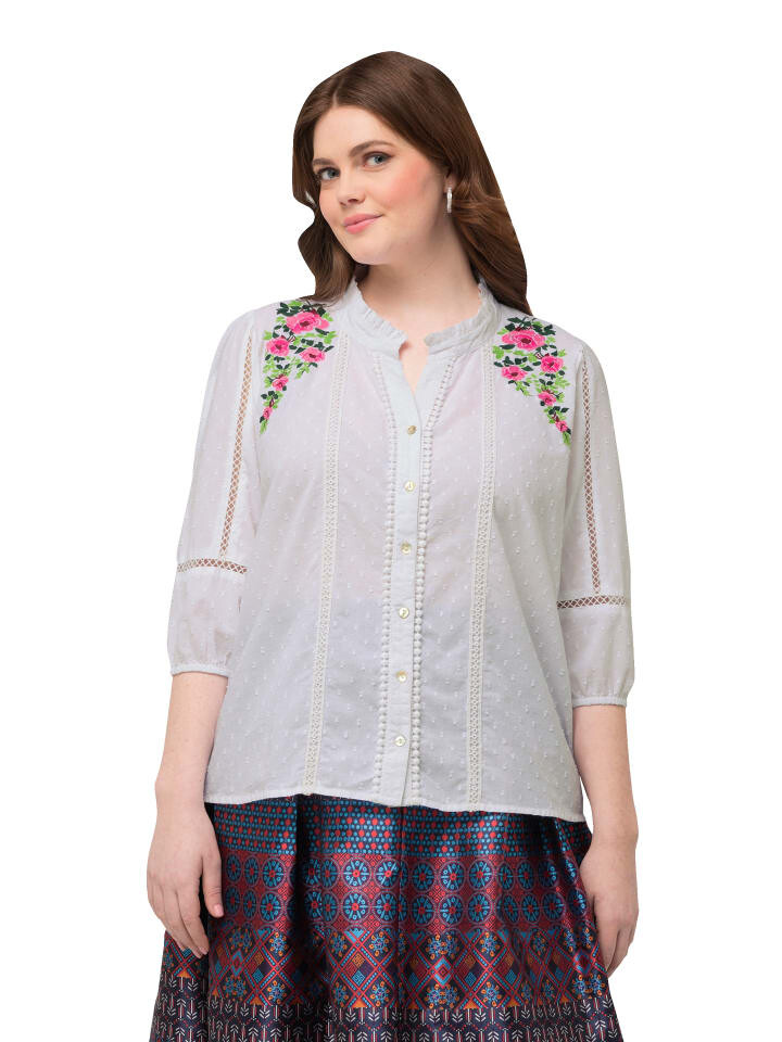 Блуза А-силуэта с тонким кружевом и цветочной вышивкой на плечах. Круглый вырез горловины V-образный, рукава 3/4 с эластичными манжетами. Слегка закругленный низ.