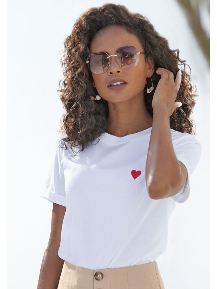 Милая рубашка от Lascana с контрастной вышивкой в виде сердечек спереди. Круглый вырез горловины с манжетами, короткие рукава и прямой подол. Универсальный стиль. Мягкий хлопковый трикотаж.