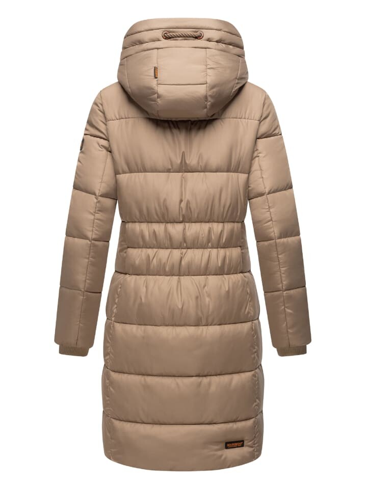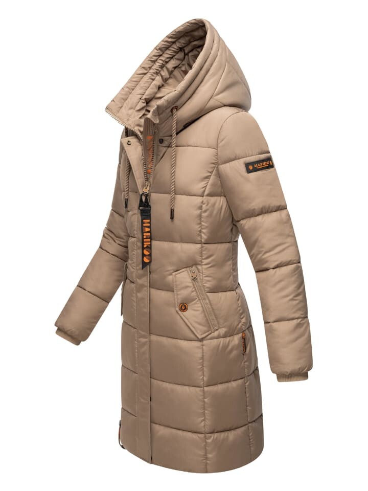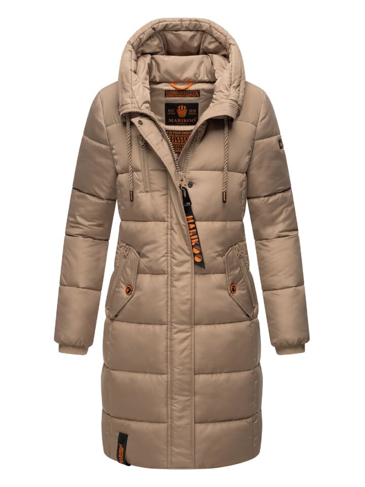 ВИД: Длинное женское стеганое пальто с длиной верха чуть выше колен, удобным большим капюшоном и контрастными цветными элементами от бренда Marikoo. МАТЕРИАЛ: Платье для отдыха на открытом воздухе впечатляет матовым мерцающим внешним материалом, наружными карманами на флисовой подкладке и теплые ребристые манжеты на концах рукавов. Гладкая внутренняя подкладка делает женское пальто удобным в ношении. ПОСАДКА: прямой, но подчеркивающий фигуру крой позволяет носить под ним теплую зимнюю одежду, не ограничивая свободу движений. спинка на высоте талии даже создает приятный визуальный эффект, капюшон можно застегнуть шнурками. Ширину можно регулировать - идеальная защита от ветра и непогоды. Полиэстер, набивка: 100 % полиэстер, подкладка рукавов: 100 % полиэстер