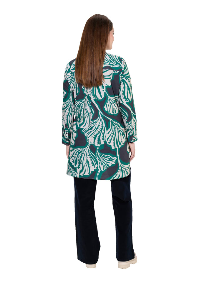 Длинная блузка из натурального хлопка, слегка оверсайз с узором в виде листьев. Воротник рубашки, планка на пуговицах. Длинные рукава с манжетами. Слегка закругленный низ с длинными боковыми разрезами - гладкая драпировка, идеальный комфорт при ношении. Органический; сертифицирован ECOCERT Greenlife, лицензия № 152026.
