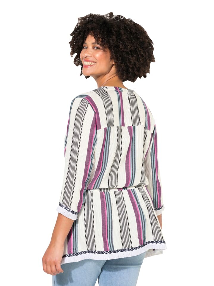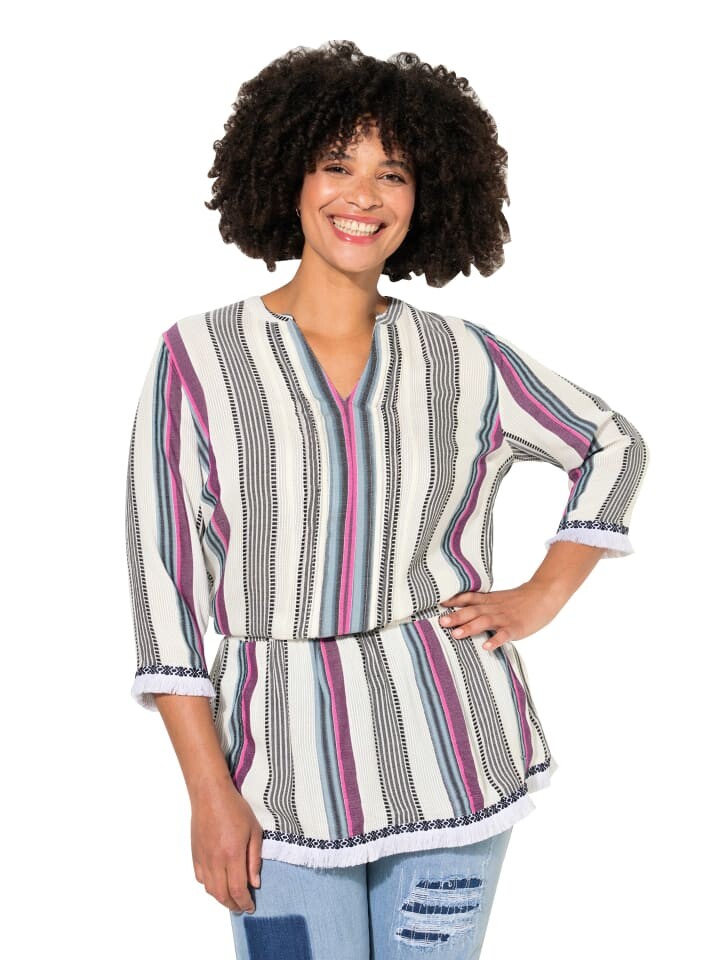 Туника удобного кроя, выполнена из качественного жаккарда с полосатым узором. Горловина круглой формы с разрезом и мелко пришитой окантовкой до поперечного шва. Удобный широкий низ, рукава 3/4.