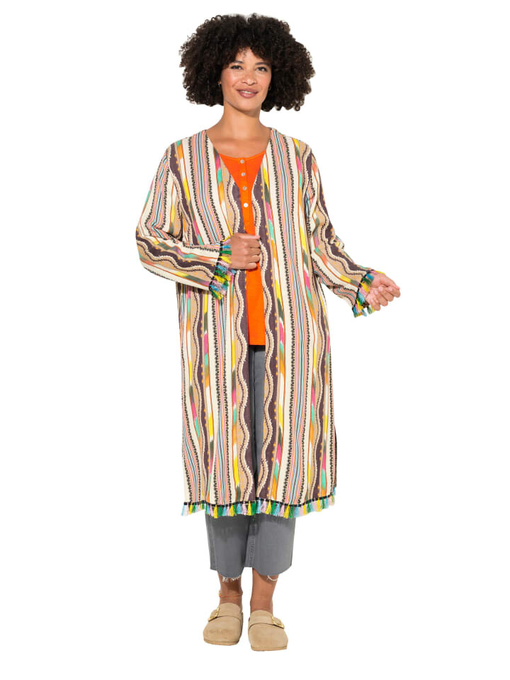 Кимоно свободного кроя, выполнено из трикотажа с миксом рисунков. Удлиненная открытая форма с V-образным вырезом и длинными рукавами. Внешний материал: 100 % хлопок.