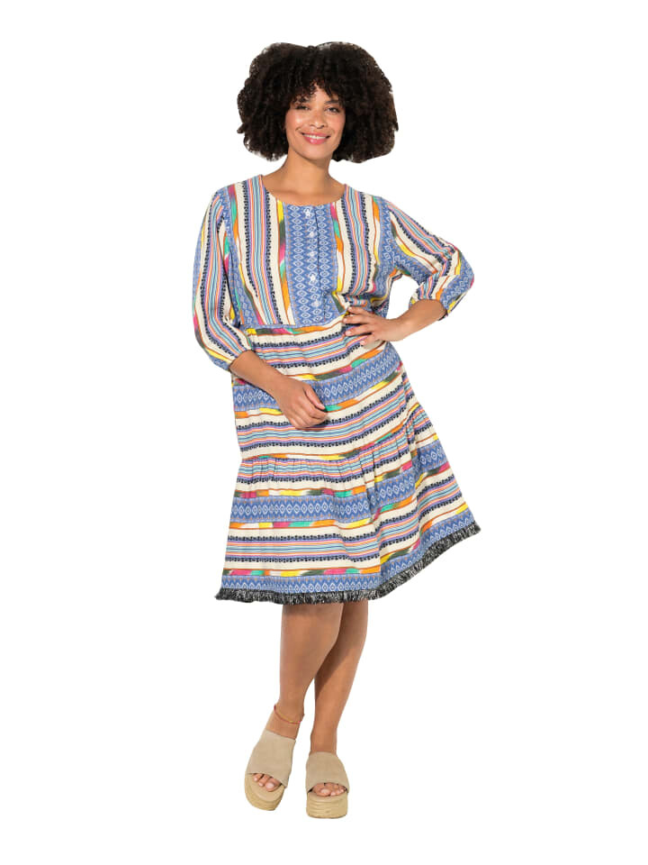 Платье макси А-силуэта с узорными полосками. Круглый вырез горловины, планка на пуговицах, воланы. Рукава 3/4 с эластичными манжетами. Внешний материал: 100% хлопок.