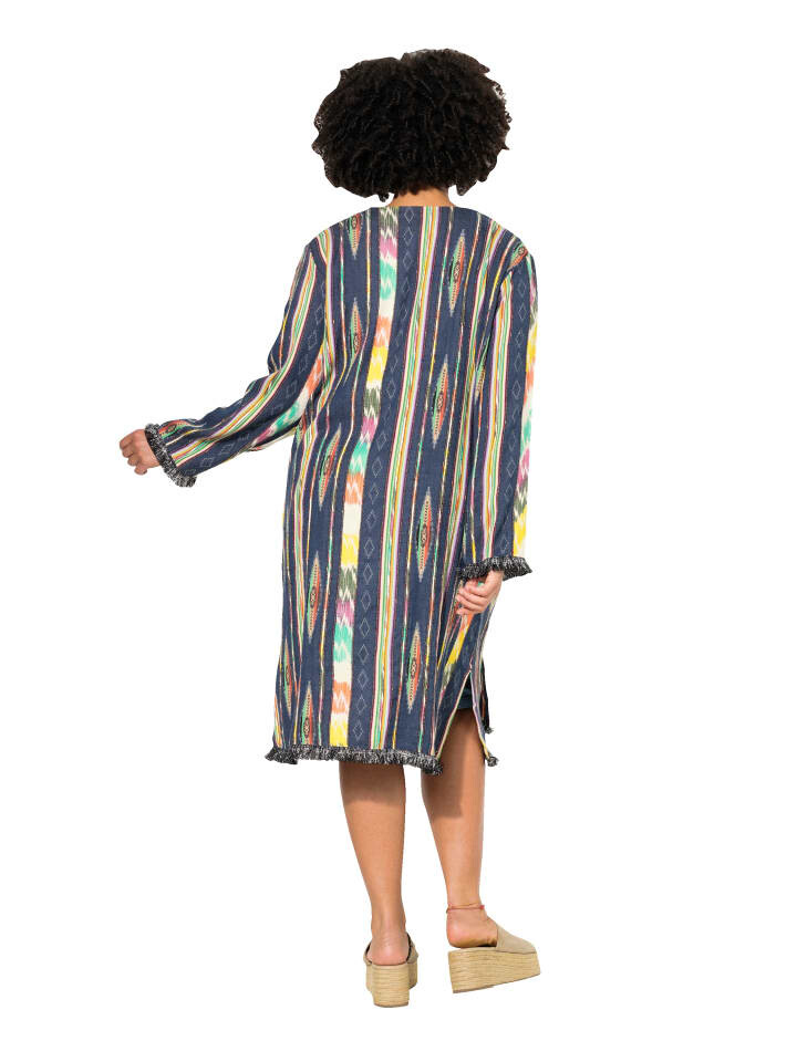 Кимоно свободного кроя выполнено из качественного жаккарда с миксом рисунков. Удлиненная открытая форма с V-образным вырезом и длинными рукавами с блестящей бахромой. Внешний материал: 100% хлопок.