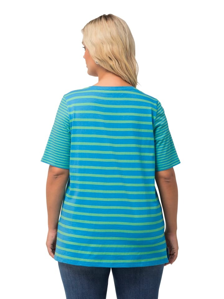 Рубашка в полоску, А-силуэта, в полоску. V-образный вырез, полурукава и разрезы по бокам для еще большего комфорта.