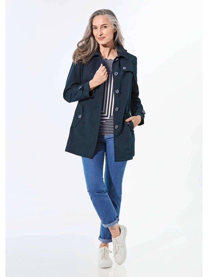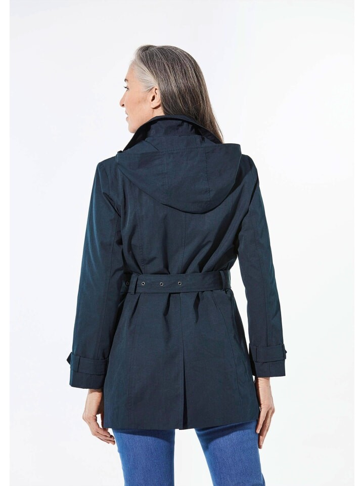 Короткое пальто с классическими элементами тренча и съемным капюшоном. Пуговица с четырьмя отверстиями в форме рога добавляет элегантности. Формирующие разделительные швы и пояс подчеркивают фигуру. Тональная подкладка с практичными внутренними карманами и заднее зеркало со стильной вышивкой логотипа свидетельствуют о высоком качестве изготовления. В качестве с покрытием, с содержанием хлопка и водоотталкивающей функцией он идеально подходит для переменчивой погоды. Длина, закрывающая бедра, и эластичная посадка делают его идеальным спутником на каждый день. Длина около 83 см по размеру. 46, размер около 79 см. 23.