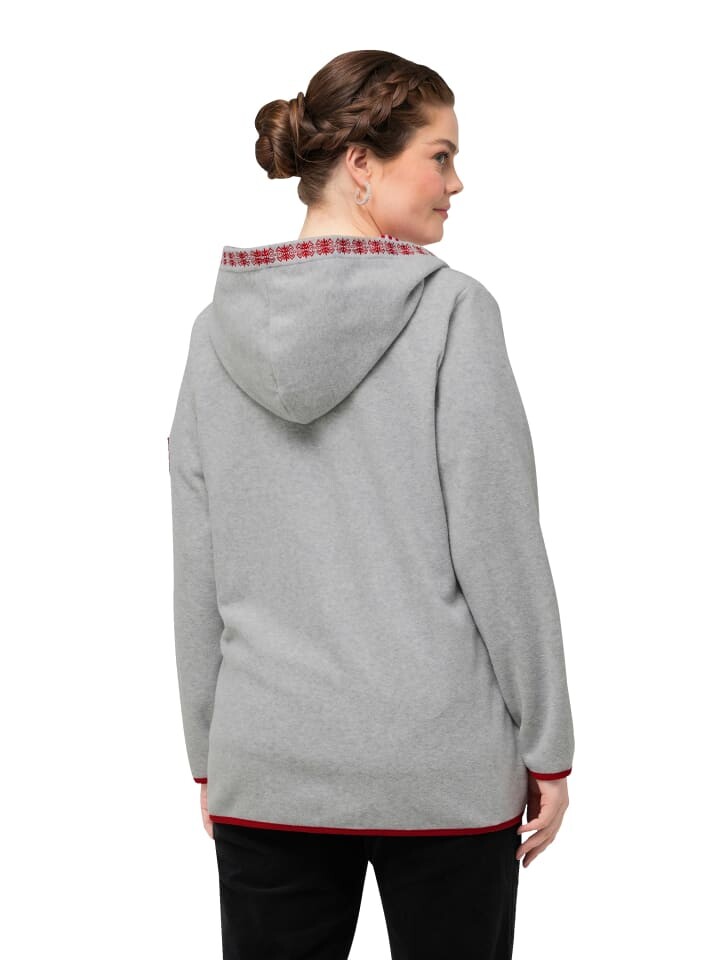 Традиционная флисовая куртка с типичной декоративной вышивкой. Капюшон на клетчатой подкладке, молния, длинные рукава. Боковые карманы, цветная окантовка.