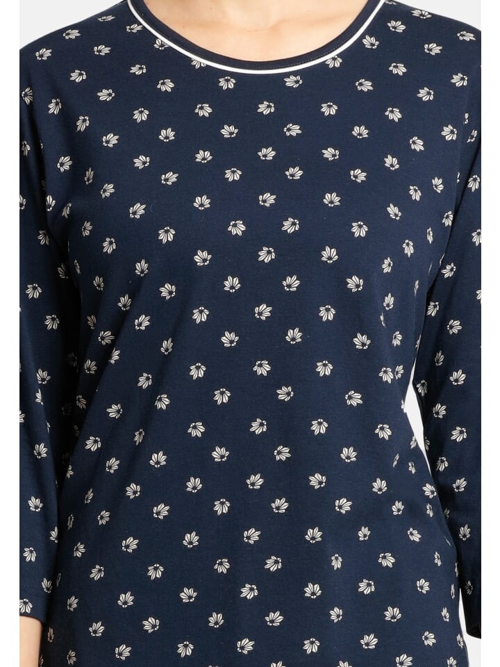 Этот пижамный комплект особенно удобен по двум причинам: удобный материал из прочного хлопка, а топ и брюки имеют удобную длину 3/4 и 7/8 соответственно. Топ подчеркивает фигуру особенно красиво благодаря круглому вырезу с контрастной окантовкой.