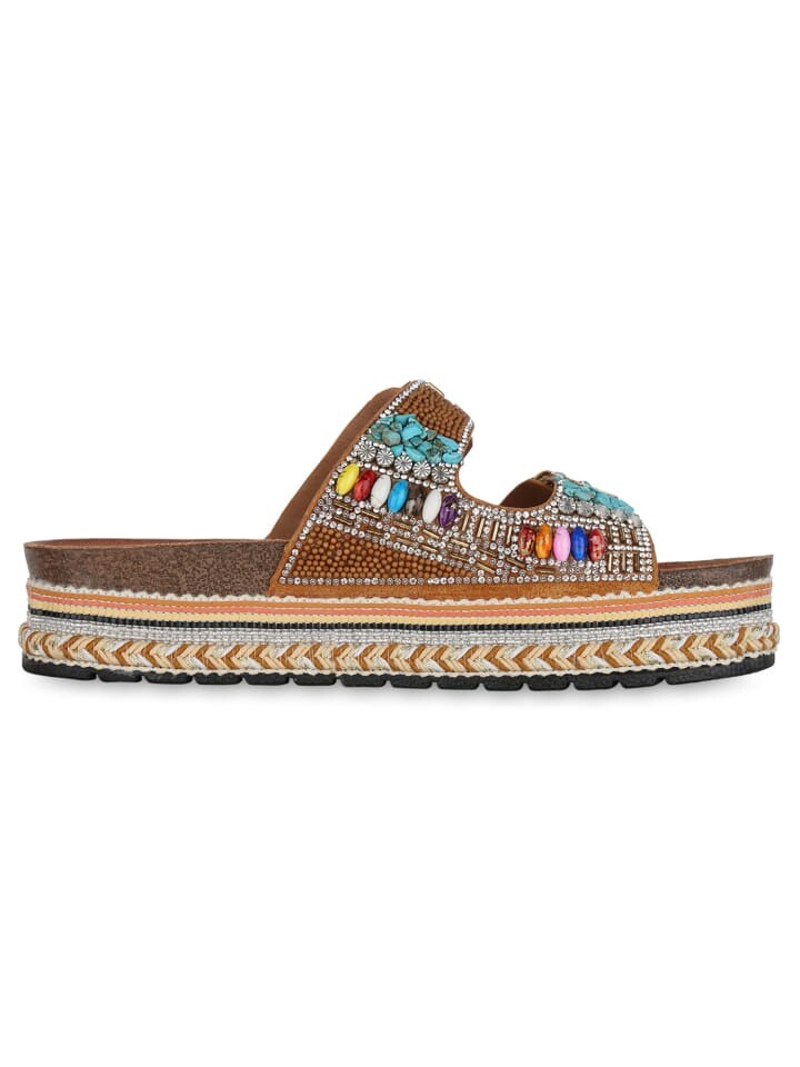 С моделью обуви: мюли – нет ничего лучшего. Обувь очень модная и прекрасно сочетается со многими нарядами. Женская обувь – популярный выбор по сезону: весна, лето. Обувь без подкладки. Стиль обуви: модный и привлекает внимание. Кроме того, практичный тип застежки: отсутствие застежки позволяет легко надевать и снимать. Еще одна изюминка – детали обуви: стразы, декоративный жемчуг, этнический вид. Благодаря материалу верха — синтетической коже, эти сандалии просты в уходе и долговечны. Внутренний материал: синтетическая кожа обеспечивает удобную посадку, стелька: синтетическая кожа обеспечивает комфорт при ходьбе, а подошва поддерживает каждый шаг. Благодаря форме каблука: платформа и высоте каблука: 3,5 см, а также носку: открытый спереди, эти туфли прекрасно сочетаются с любым образом и случаем.