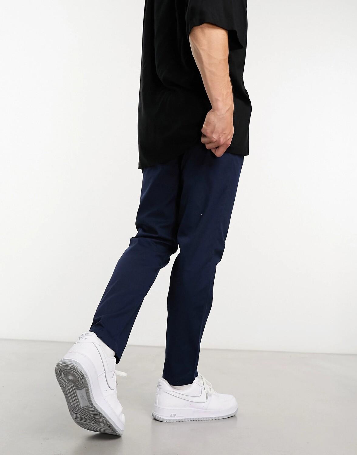 Зауженные брюки-чинос с застежкой на пуговицу сшиты из полуструктурированной ткани с рисунком в виде параллельных ребер.