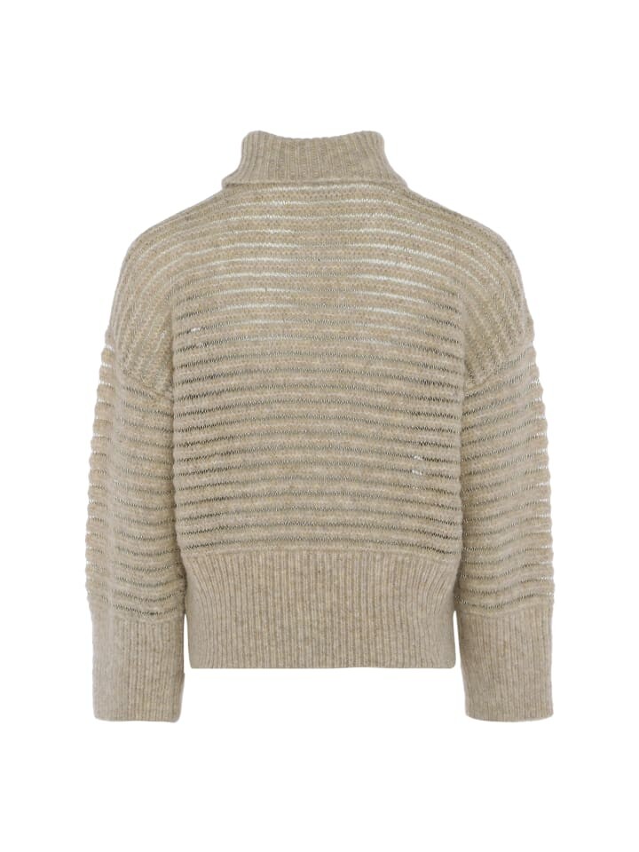 Этот свитер с высоким воротником имеет ребристую текстуру и высокий отложной воротник, закрывающий шею. Длинные рукава и приталенный пояс создают непринужденную, но стильную атмосферу. Трикотаж средней толщины с горизонтальными полосками с легким блеском идеально подходит для прохладной погоды и легко сочетает в себе тепло и моду.