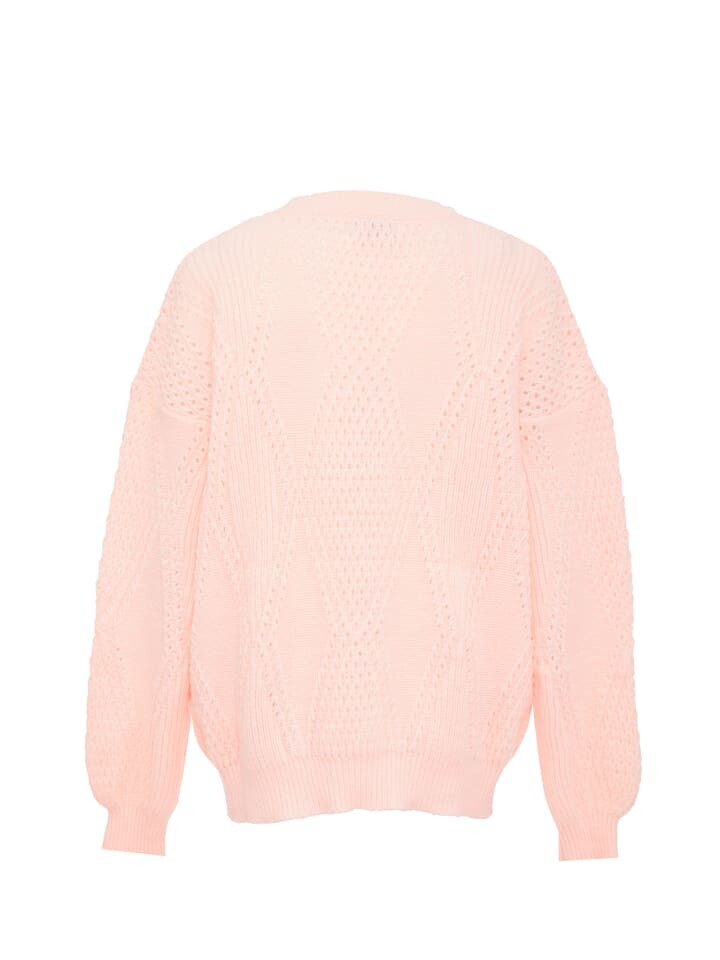 Подарите себе роскошный комфорт этого вязаного свитера. Модель с круглым вырезом и длинными рукавами украшена интригующим текстурным узором с ромбовидными узорами спереди и сзади. Детали открытой вязки добавляют визуальной интриги, а трикотажные манжеты в рубчик внизу, на манжетах и на горловине обеспечивают удобную посадку. Свободный силуэт со слегка увеличенными рукавами создает непринужденный стиль, что делает его идеальным выбором для уютного тепла в прохладные дни.