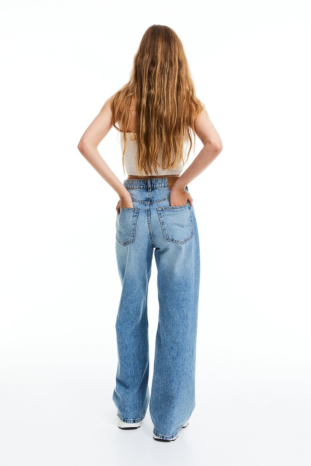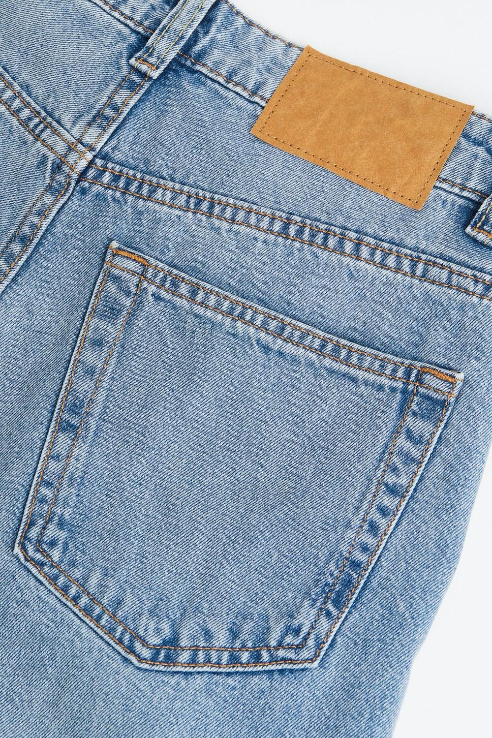 Джинсы с пятью карманами из стираного хлопкового денима. Высокая талия, застежка на молнию и пуговицу. Прямые широкие штанины.