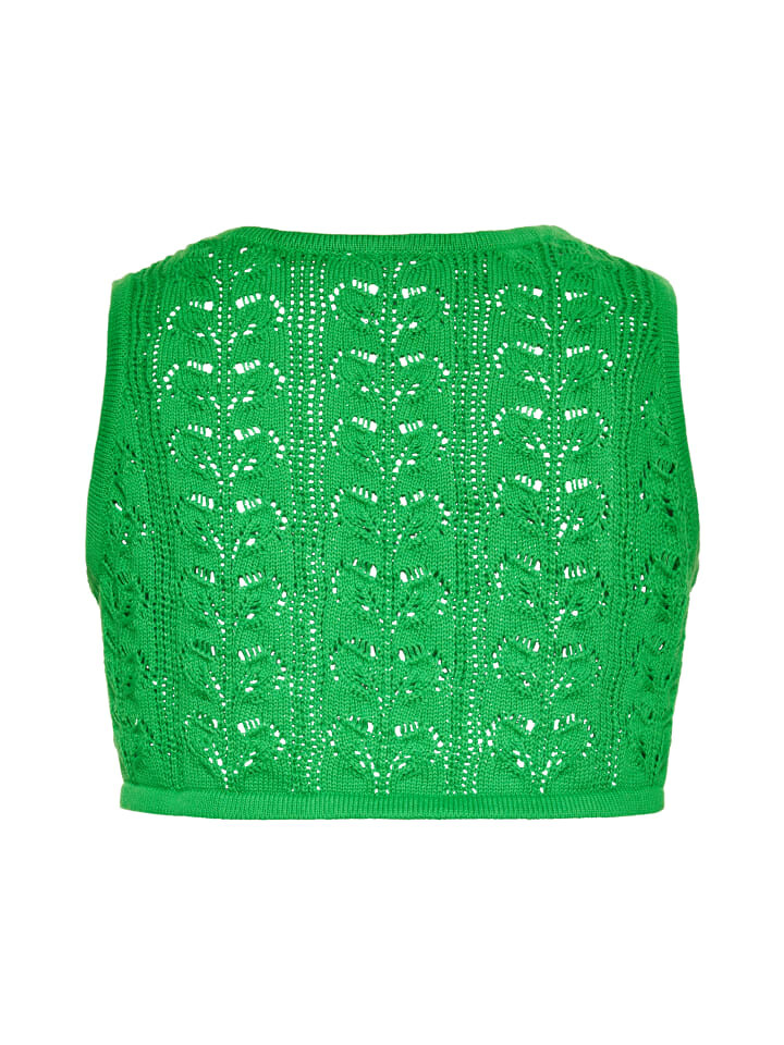 Представляем трикотажную модель без рукавов, тщательно выполненную с нежным кружевным узором. Это укороченное изделие, предназначенное для повседневной или летней одежды, украшено повторяющимися мотивами, вдохновленными природой. Округленный вырез горловины и ребристая фактура по нижнему краю придают определенную элегантность.