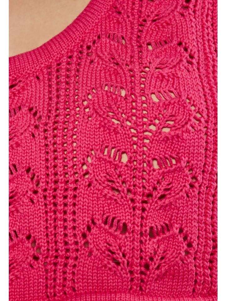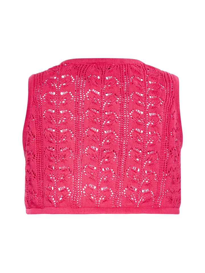 Представляем трикотажную модель без рукавов, тщательно выполненную с нежным кружевным узором. Это укороченное изделие, предназначенное для повседневной или летней одежды, украшено повторяющимися мотивами, вдохновленными природой. Округленный вырез горловины и ребристая фактура по нижнему краю придают определенную элегантность.