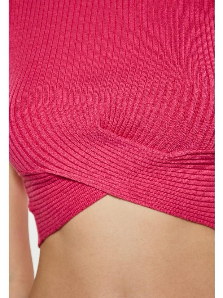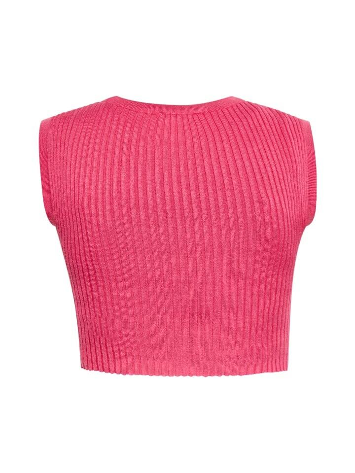 Стильный и универсальный кроп-топ с ребристой текстурой. Топ без рукавов с высоким круглым вырезом и горизонтальным ребристым узором по всей поверхности. Уникальный дизайн диагональных ребер в нижней части переда по центру создает привлекательный визуальный эффект и подчеркивает талию. Благодаря облегающему крою и эластичной ткани этот топ обеспечивает стиль и комфорт для любого случая.