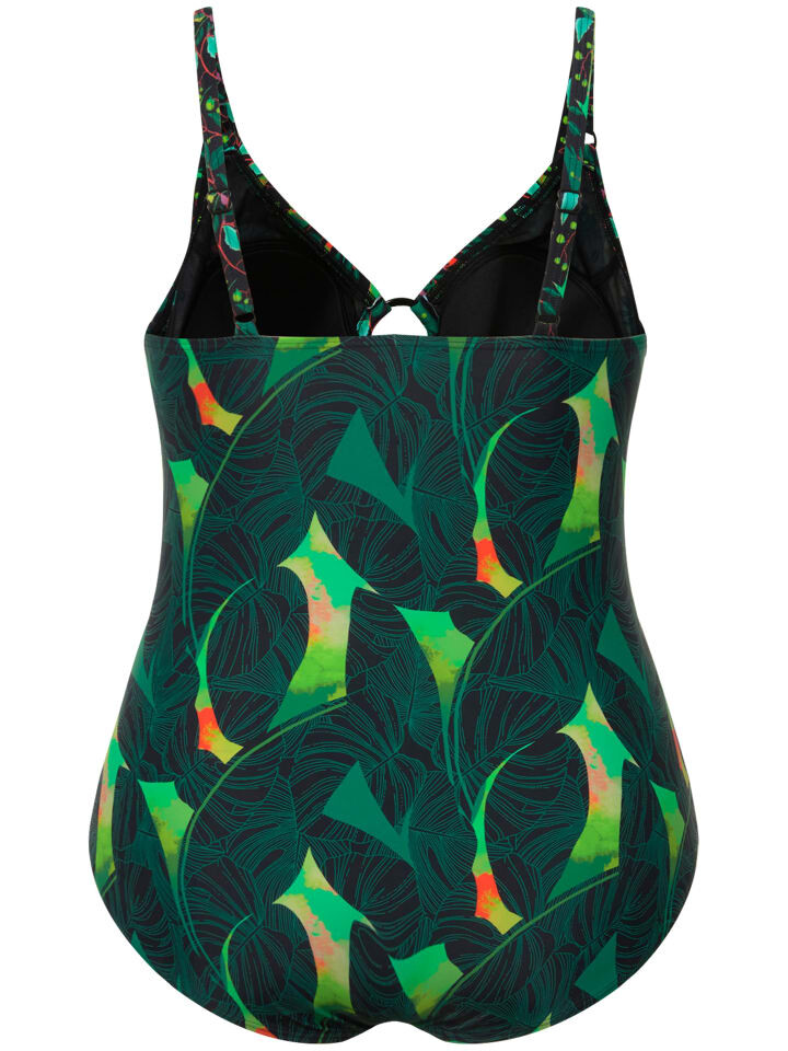 Купальник с мягкими чашками и графичным миксом узоров. Вырез с небольшим углублением, декоративным кольцом и однотонными полосками. Поддерживающая лента под грудью, подкладка спереди. Изготовлено из переработанного полиамида.