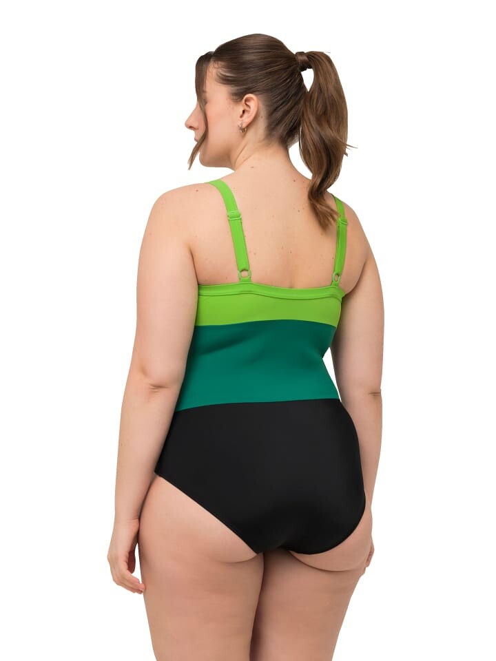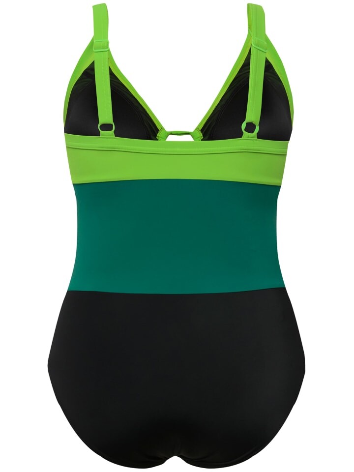 Купальник с мягкими чашками и колор блоком. Женственный драпированный вырез, поддерживающая лента под грудью, подкладка спереди. Регулируемые бретели-спагетти. Изготовлено из переработанного полиамида.