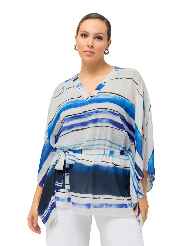 Шифоновая туника оверсайз из шифона с волнистым полосатым принтом. Узкая завязка на талии – всегда ваш желаемый силуэт. V-образный вырез, заниженная линия плеча, рукава 3/4. Внешний материал: 100% полиэстер.