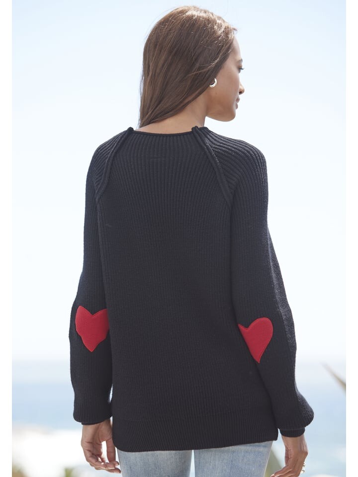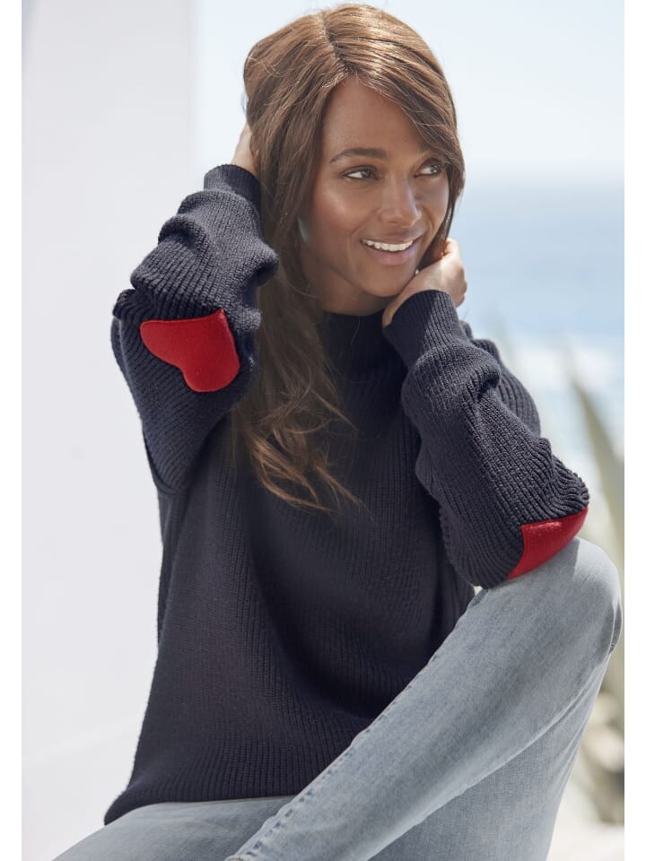 Пуловер LASCANA из мягкой рубчатой вязки с небольшим воротником-стойкой. Рукава реглан с заплатками на локтях. Длина около 60 см. Мягкое качество трикотажа.