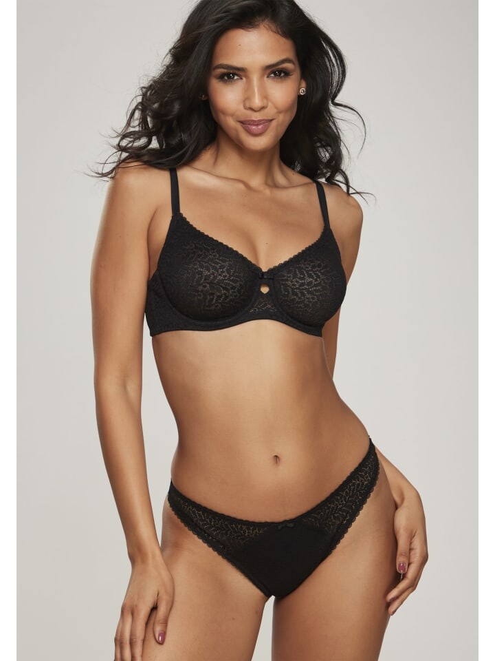 Женственные стринги соблазнительного кроя. Выполнено полностью из элегантного, слегка прозрачного кружева. С изящным декоративным бантиком посередине спереди. Со встроенной хлопковой ластовицей. В наличии бюстгальтер из этой же серии. Внешний материал: 91% полиамид, 9% эластан.