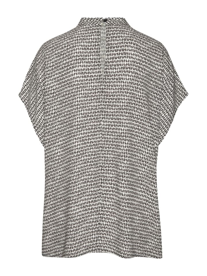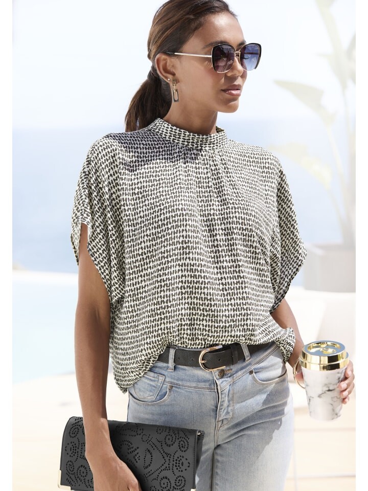 Блузка от Lascana с кольчужным принтом по всей поверхности. Узкий воротник-стойка. Небольшой разрез, застежка на две пуговицы сзади. Короткие рукава кимоно. Прямой подол блузки. Свободный, воздушный крой. Ткань из вискозы.