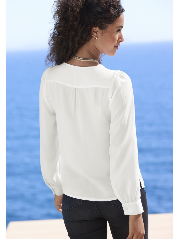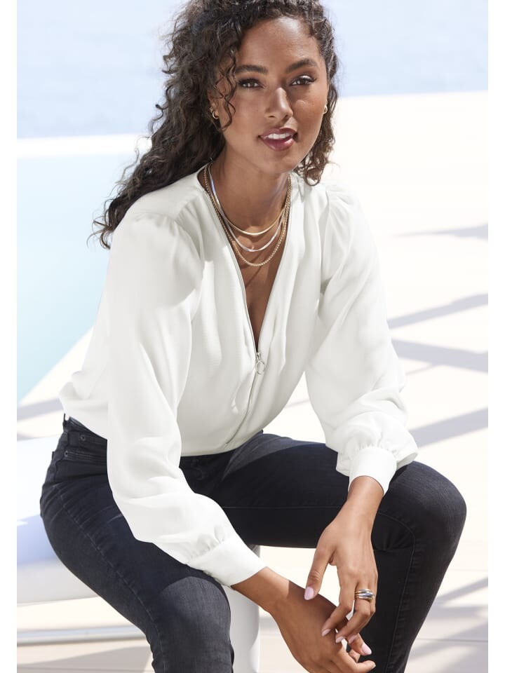 Повседневная блузка от Lascana с V-образным вырезом и украшением на молнии спереди. Плечевые швы присборены. Длинные рукава с манжетами. Низ блузки прямой, с разрезами по бокам. Свободная посадка. Слегка структурированное, простое в уходе качество ткани.