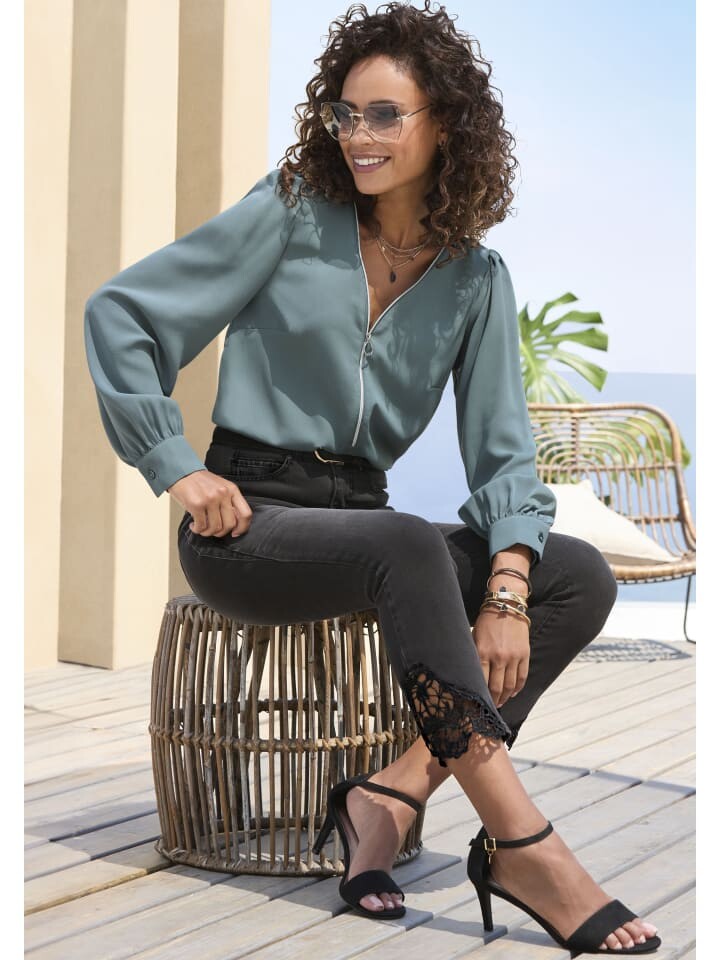 Повседневная блузка от Lascana с V-образным вырезом и украшением на молнии спереди. Плечевые швы присборены. Длинные рукава с манжетами. Низ блузки прямой, с разрезами по бокам. Свободная посадка. Слегка структурированное, простое в уходе качество ткани.