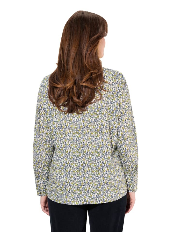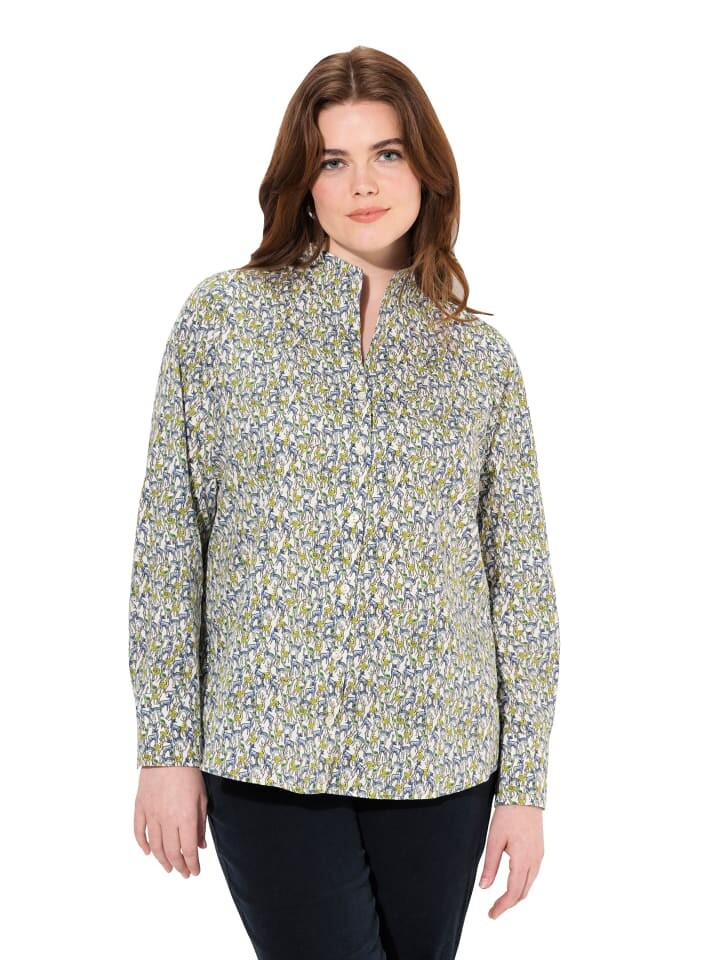 Блуза классического кроя с декоративным принтом. Воротник-кубок с небольшим V-образным вырезом, планка на пуговицах. Длинные рукава с манжетами. Боковые разрезы для плавного спада. Внешний материал: 100% хлопок.