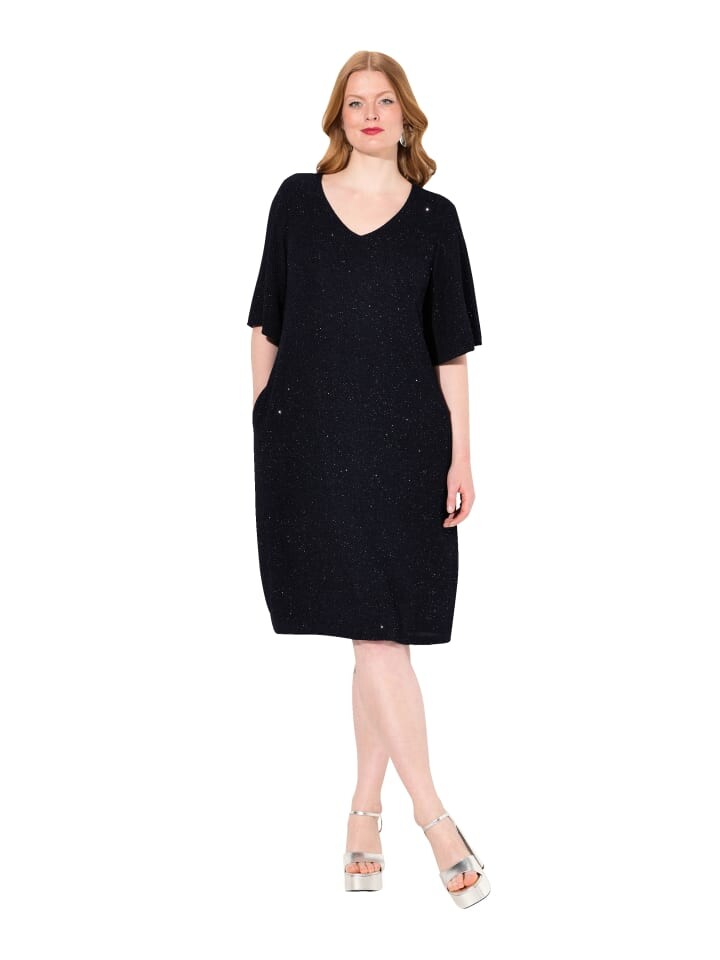 Платье А-силуэта с тонким эффектом блеска. V-образный вырез, широкие рукава 3/4, подкладка для максимального комфорта при ношении.