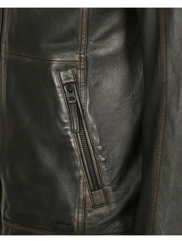 Современная кожаная мужская куртка от модного бренда Mustang. Куртка имеет красивую строчку в области подола, плеч и плеч. Он оснащен двумя боковыми карманами на молнии, двумя нагрудными карманами и двумя внутренними карманами, один на кнопке, другой на молнии. Благодаря прямому крою, короткому воротнику-стойке с регулируемой пряжкой и легкой подкладке гарантируется приятный комфорт при ношении.