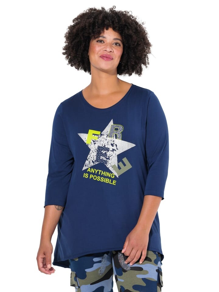 Футболка удобного кроя, с блестящей звездой и открытыми краями. Круглая горловина, рукава 3/4. Низ закругленный и удлиненный сзади. Внешний материал: 100% хлопок.