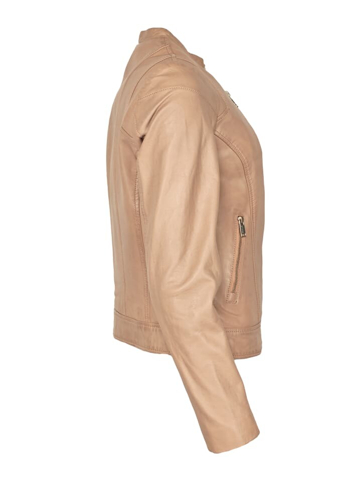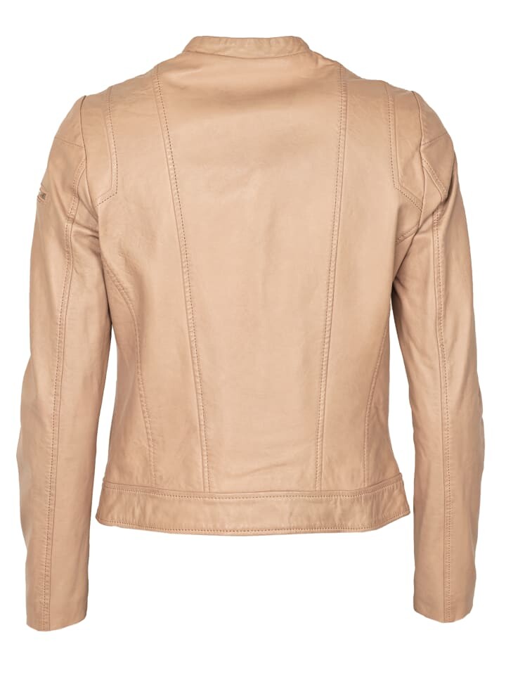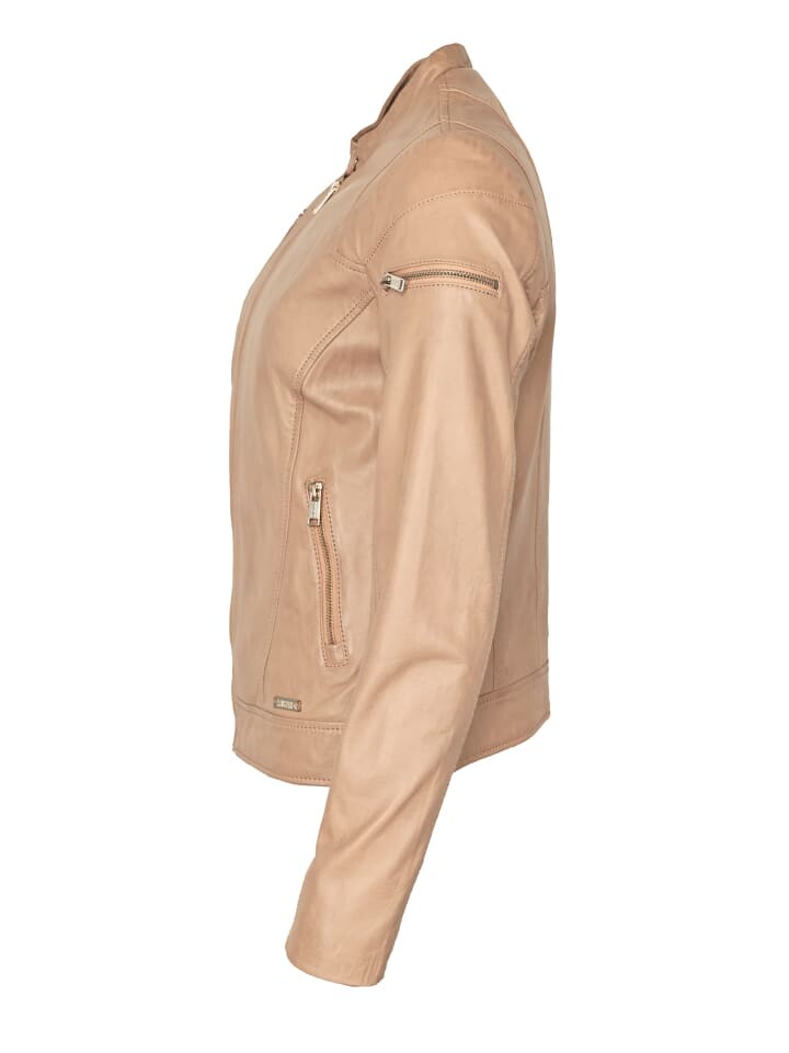Современная кожаная женская куртка из тонкой овчины от модного бренда Mustang. Два встроенных кармана на молнии, короткий воротник-стойка на кнопках и изящные декоративные швы делают эту куртку особенной.