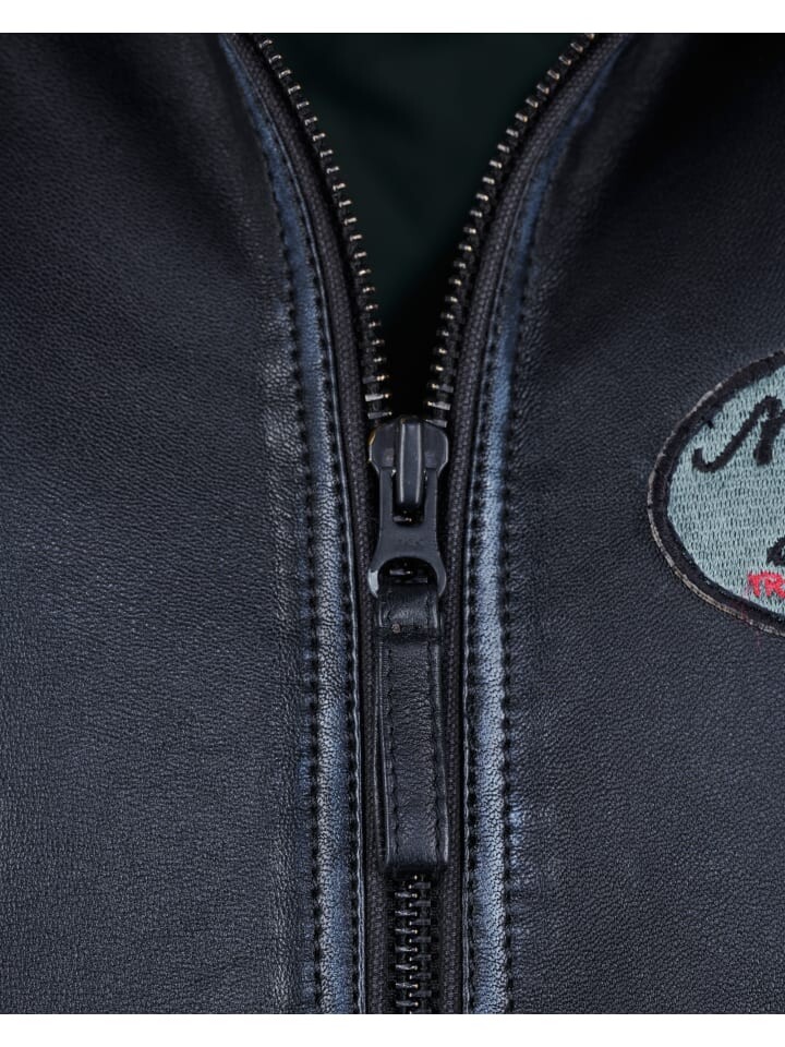 Повседневный и современный крой, а также нашивки на груди и рукавах характеризуют эту повседневную кожаную куртку. Боковые карманы на молнии и короткий воротник-стойка в байкерском стиле делают эту куртку изюминкой.