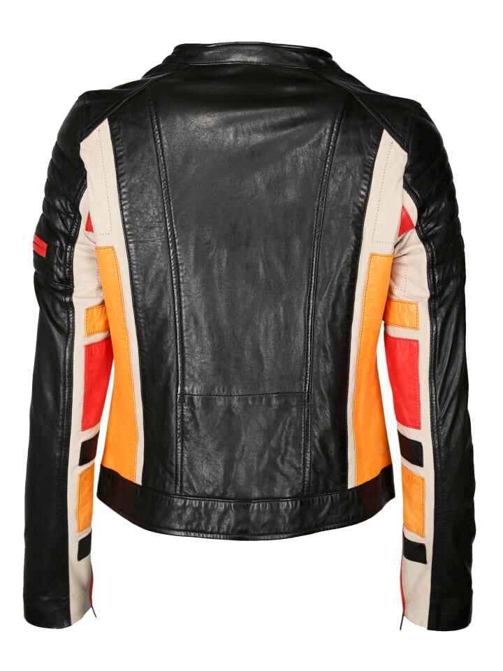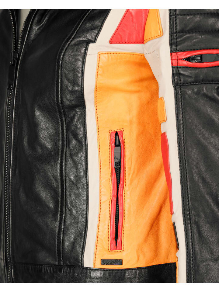 Байкерская кожаная куртка от модного бренда MAZE. Куртка имеет прямую молнию, два вертикальных боковых кармана на молнии и короткий воротник-стойку. Чтобы куртка идеально сидела по фигуре, в края рукавов встроена тонкая внутренняя подкладка и молнии. Кожаная куртка приобретает необыкновенный вид благодаря красивым декоративным швам, тонкой игре цветов и декоративному карману на левом плече. Кожаную куртку дополняют два внутренних кармана.