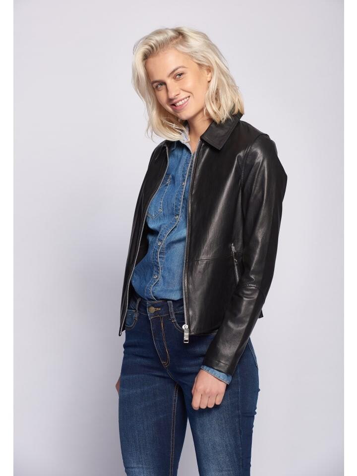 Современная женская кожаная куртка от модного бренда Maze. Куртка имеет два боковых кармана, каждый на молнии, и внутренний карман. Застегивается на прямую молнию и имеет красивый элегантный рубашечный воротник. Простой дизайн с красивыми декоративными швами.