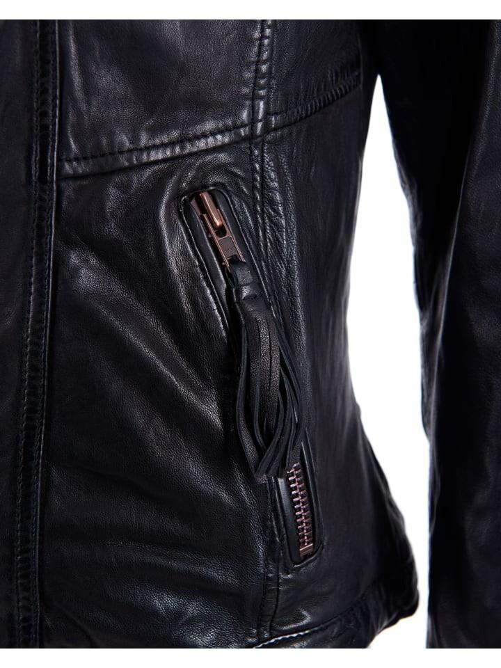 Боковые карманы на молнии искусно прошиты из мягкой овечьей кожи. Застегивается на прямую молнию и кнопку на воротнике-стойке. По низу и рукавам также имеется встроенная проволока, позволяющая дополнительно регулировать посадку. Благодаря многочисленным мелким и визуально привлекательным деталям это красивая куртка для весны и лета.