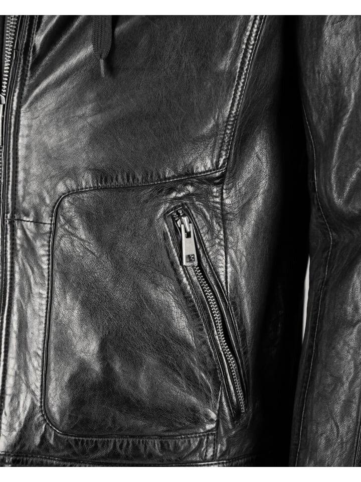 Куртка имеет съемный капюшон, который можно снять с помощью молнии, включая всю вставку. Также имеется два встроенных боковых кармана и два кармана на молнии на уровне ключиц. Визуальные акценты, такие как тонкая строчка на плечах и изящные декоративные швы, придают этой куртке необыкновенный характер. Мягкая кожа со слегка приталенным кроем обеспечивает оптимальную посадку и удобную посадку.