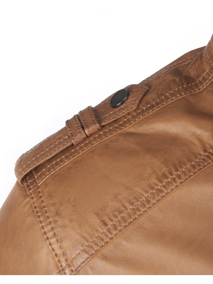 Спортивная повседневная кожаная куртка с воротником стойкой и клапанами на плечах. Куртка имеет два нагрудных кармана, которые закрываются на кнопки.