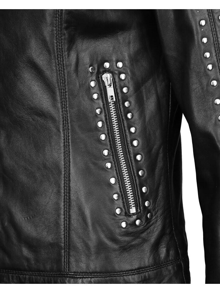 Эта кожаная куртка из ягненка имеет два встроенных кармана на молнии и красивые заклепки на рукавах, шее и плечах. Куртка застегивается на молнию, слегка скроена и плотно прилегает к телу. Оснащен круглым воротником, который можно застегнуть на кнопку.
